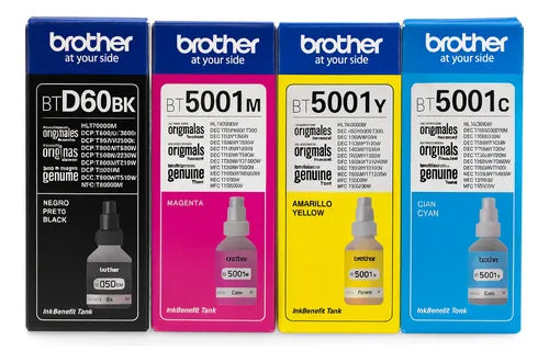 Kit 4 Botellas de Tinta Brother BT5001Y/M/C BTD60BK Originales (Negro, Cian, Magenta y Amarillo)